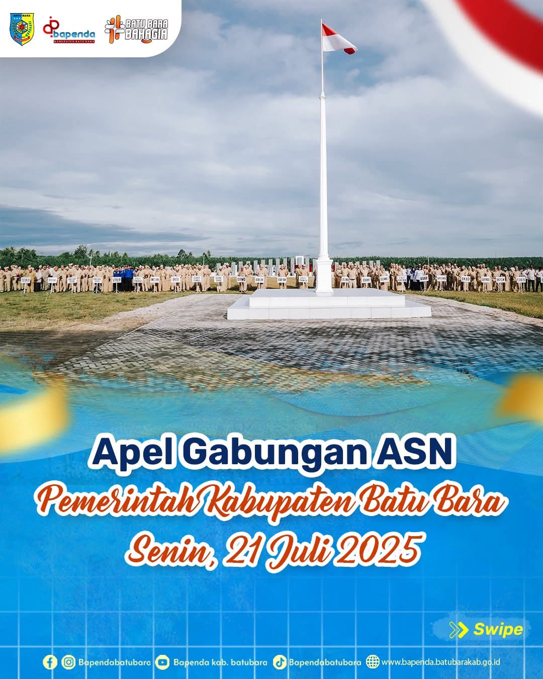 Badan Pendapatan Daerah (Bapenda) Kabupaten Batu Bara berperan sebagai penyelenggara apel gabungan aparatur sipil negara (ASN) pada Senin, 21 Juli 2025. Apel berlangsung di halaman Kantor Bupati Batu Bara, Kecamatan Lima Puluh.
