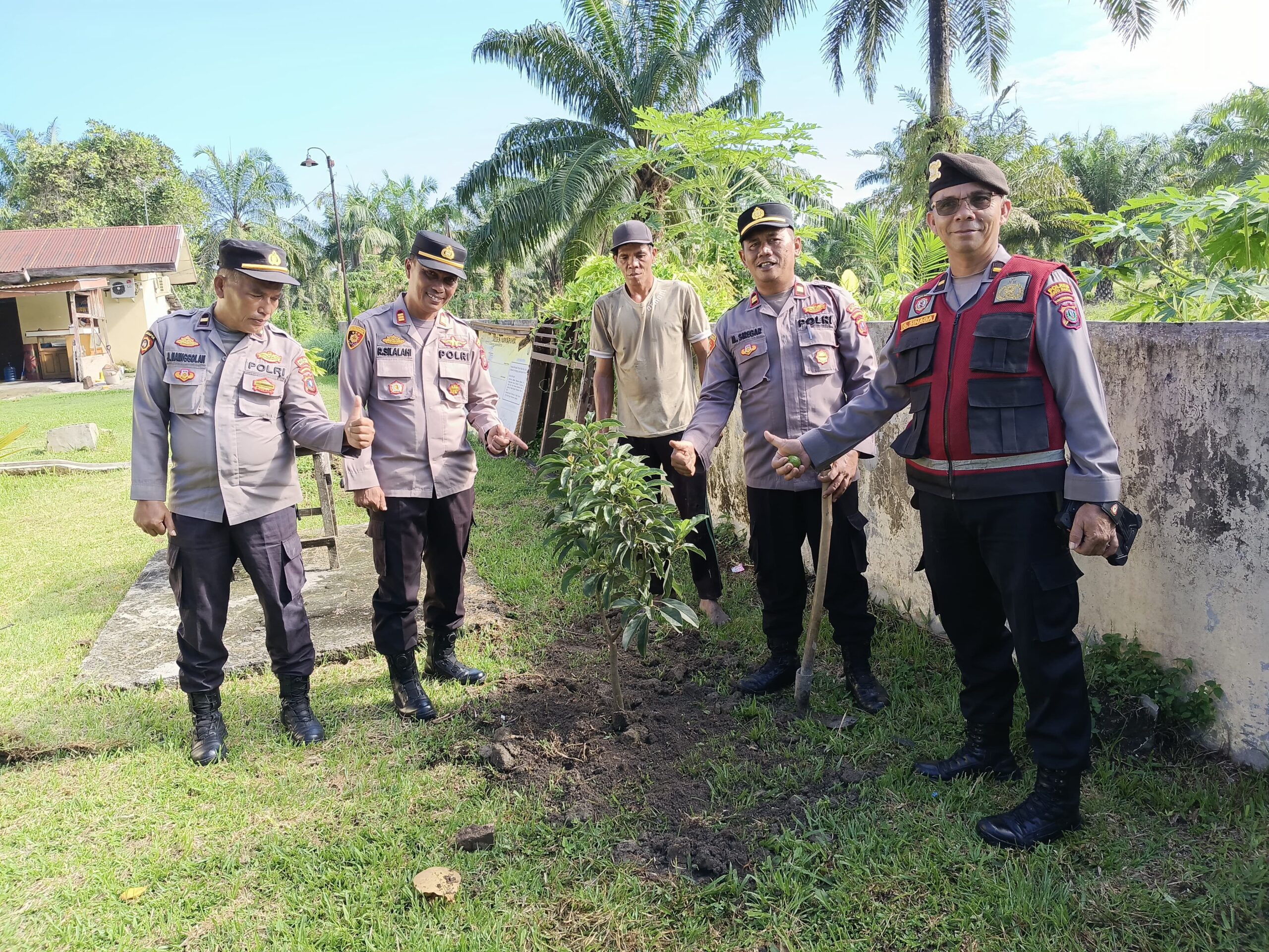Kapolsek Indrapura, AKP Reynold Silalahi, SH, bersama jajaran perwira dan personel Polsek Indrapura melaksanakan kegiatan penghijauan dengan menanam pohon alpukat di sekitar halaman Mako Polsek Indrapura, Selasa (16/9/2025) pagi.