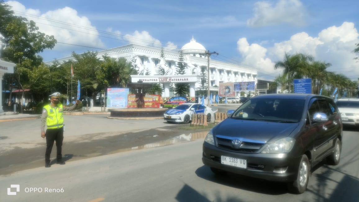 Satuan Lalu Lintas (Satlantas) Polres Batu Bara melaksanakan patroli sekaligus pengaturan arus kendaraan di kawasan Jalinsum, tepatnya di Simpang Sei Bejangkar depan Singapore Land, pada Sabtu sore,(20/9/2025).