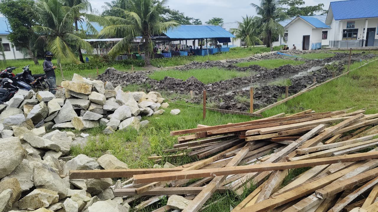 Pantauan di lokasi juga memperlihatkan adanya indikasi pelaksanaan yang tidak sesuai standar. Material bangunan tampak menggunakan bahan seadanya seperti kayu broti goplang dan bambu untuk cerocok. Beberapa titik galian pondasi bahkan tergenang air asin, sehingga menimbulkan keraguan atas kualitas dan ketahanan bangunan.