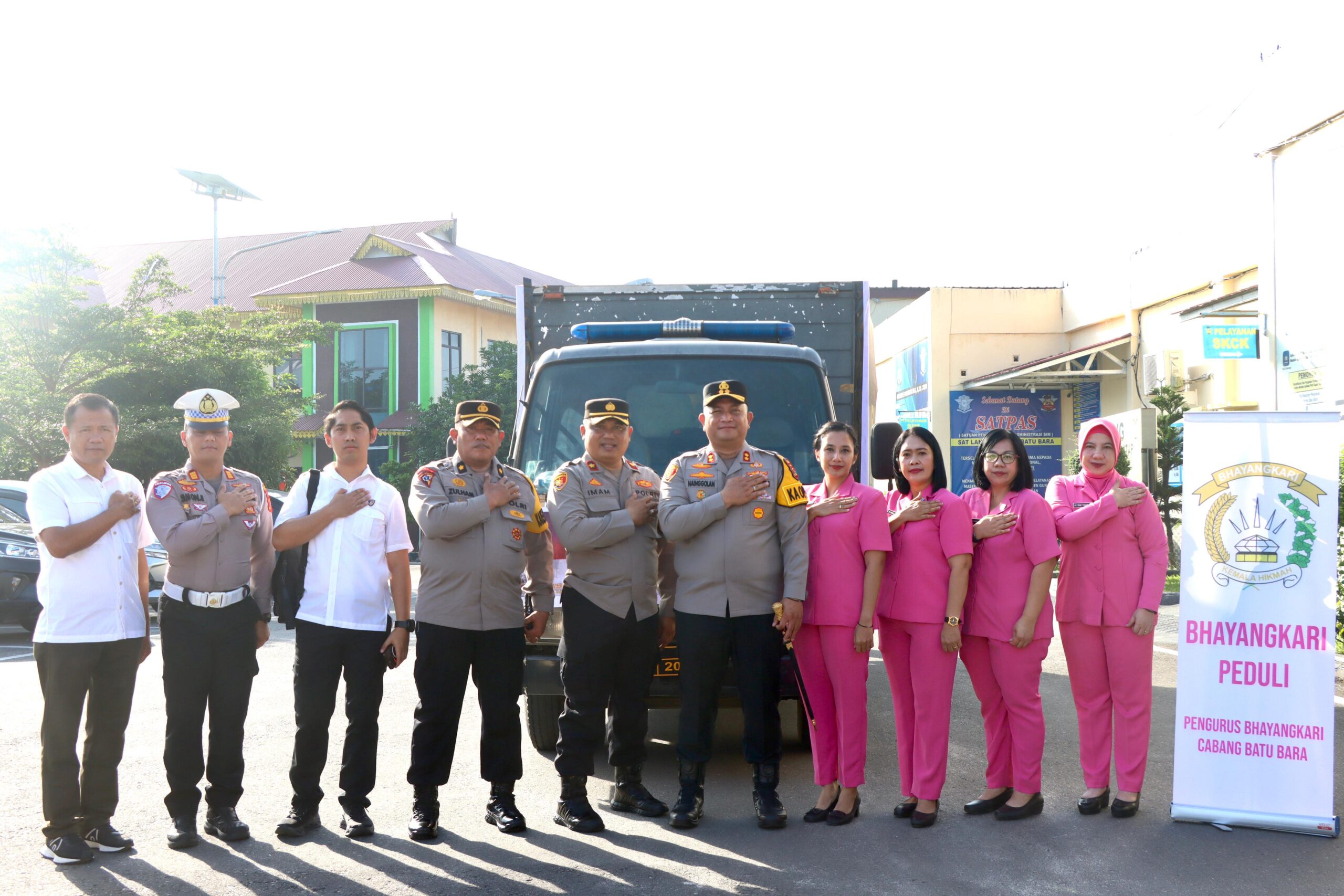 Pelepasan logistik berlangsung di halaman Mapolres Batu Bara dan dihadiri pejabat utama Polres Batu Bara serta jajaran Bhayangkari.