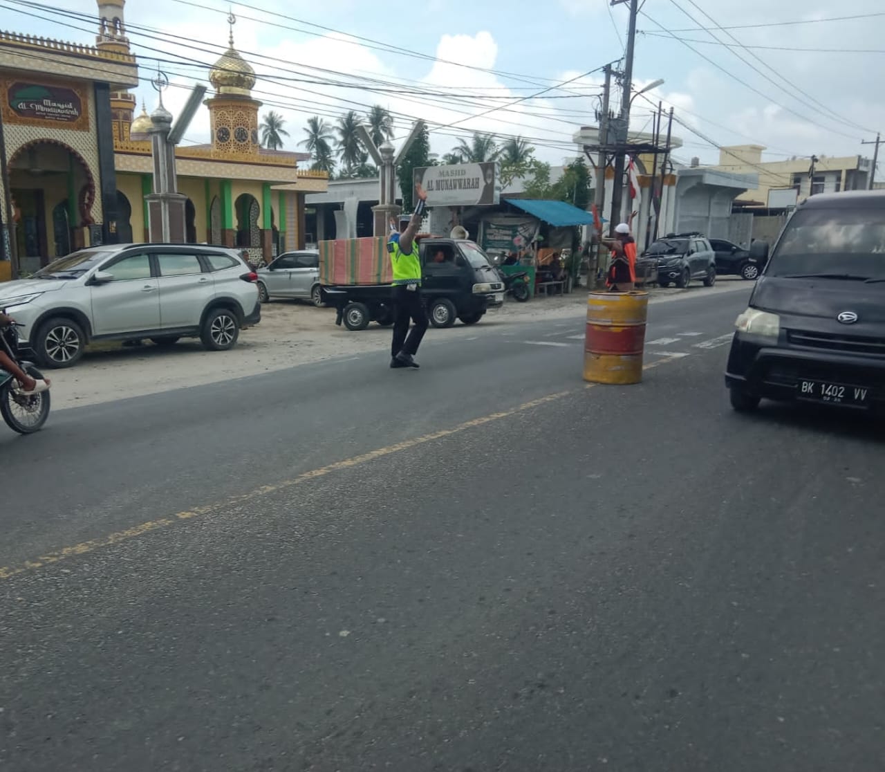 Pengaturan lalu lintas dilakukan guna membantu masyarakat yang hendak menyeberang jalan menuju area masjid, sekaligus mengantisipasi kepadatan kendaraan di sekitar lokasi ibadah.