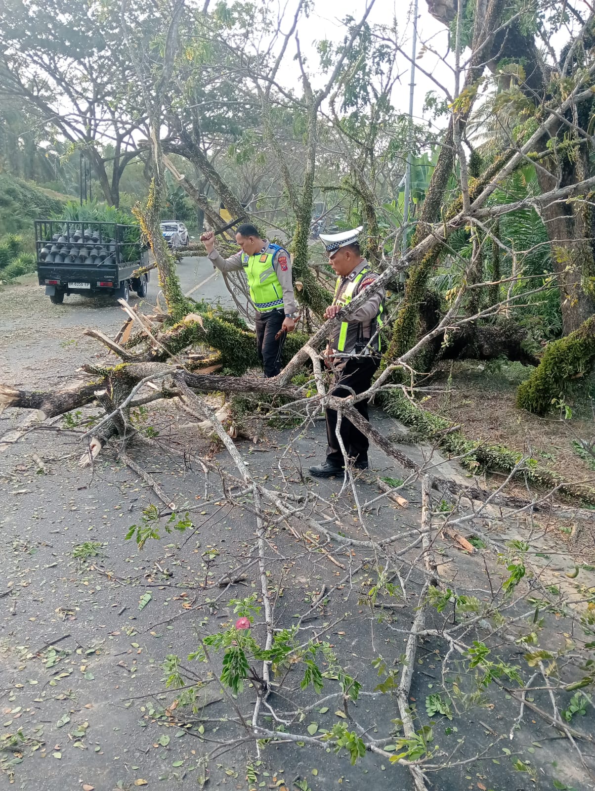 Berkat kesigapan petugas, pohon berhasil dievakuasi dan arus lalu lintas kembali normal serta aman bagi pengguna jalan.