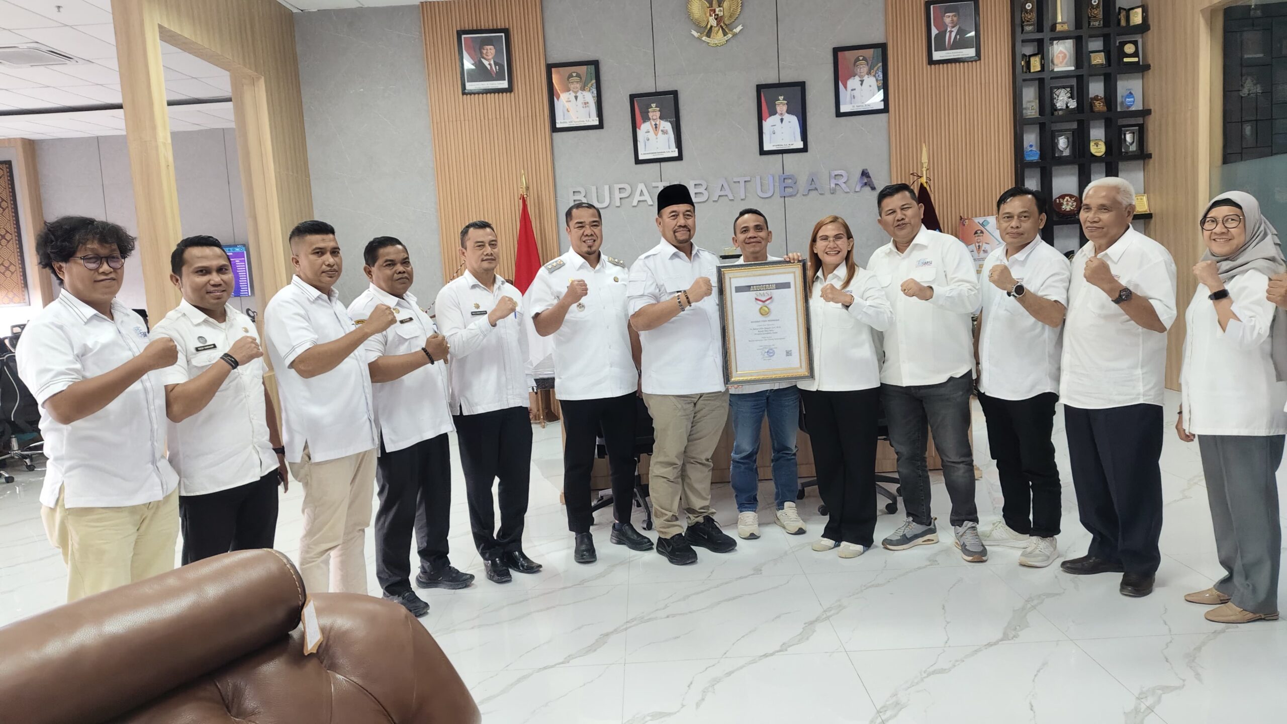 Penghargaan tersebut diserahkan langsung oleh Ketua SMSI Sumut, Erris J. Napitupulu, didampingi jajaran pengurus SMSI Provinsi Sumatera Utara dan SMSI Kabupaten Batu Bara. Penyerahan berlangsung di ruang kerja Bupati Batu Bara dan turut dihadiri Wakil Bupati Batu Bara, Syafrizal, pada Rabu (7/1/2025).