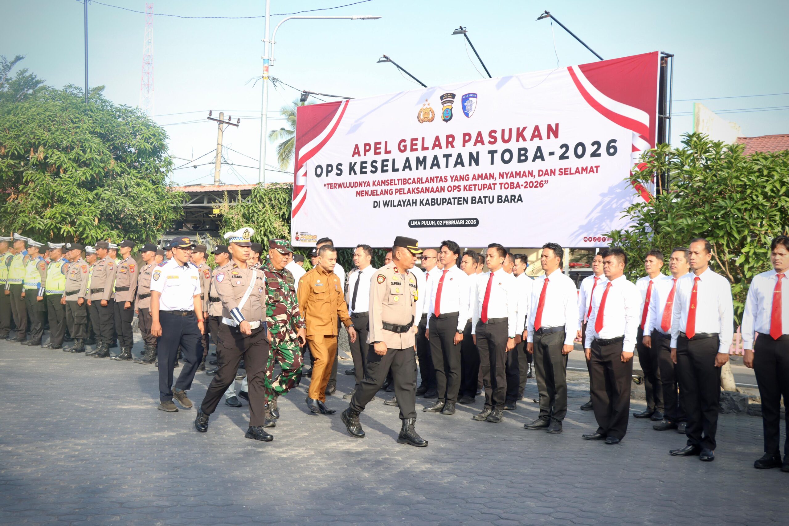 Polres Batu Bara melaksanakan Apel Gelar Pasukan Operasi Keselamatan Toba 2026 sebagai langkah awal dalam mewujudkan keamanan, keselamatan, ketertiban, dan kelancaran lalu lintas (Kamseltibcarlantas) yang aman, nyaman, dan selamat menjelang pelaksanaan Operasi Ketupat Toba 2026 di Lapangan Apel Polres Batu Bara, Senin (2/2/2026) pagi, mulai pukul 07.45 WIB hingga selesai.
