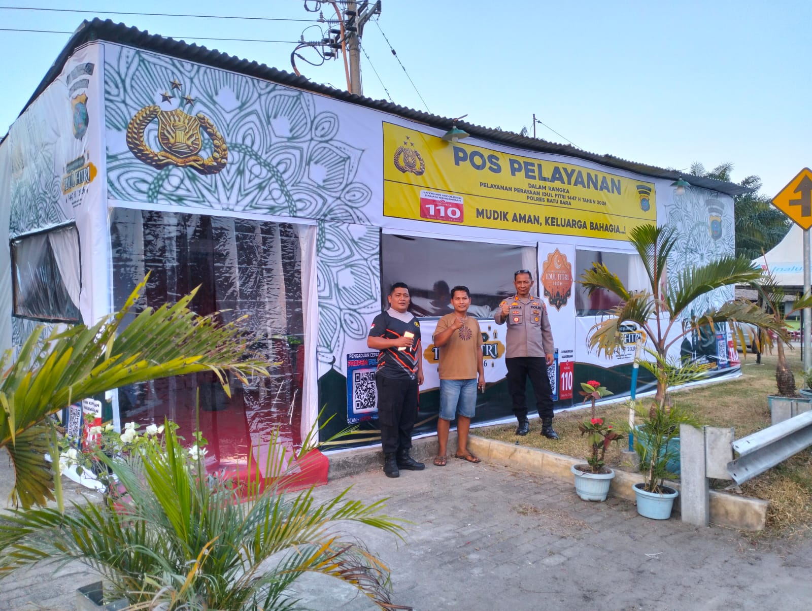 Spanduk bertuliskan imbauan “Mudik Aman dan Keluarga Bahagia” serta banner dari Propam turut dipasang sebagai bagian dari sarana informasi dan pengingat bagi masyarakat.