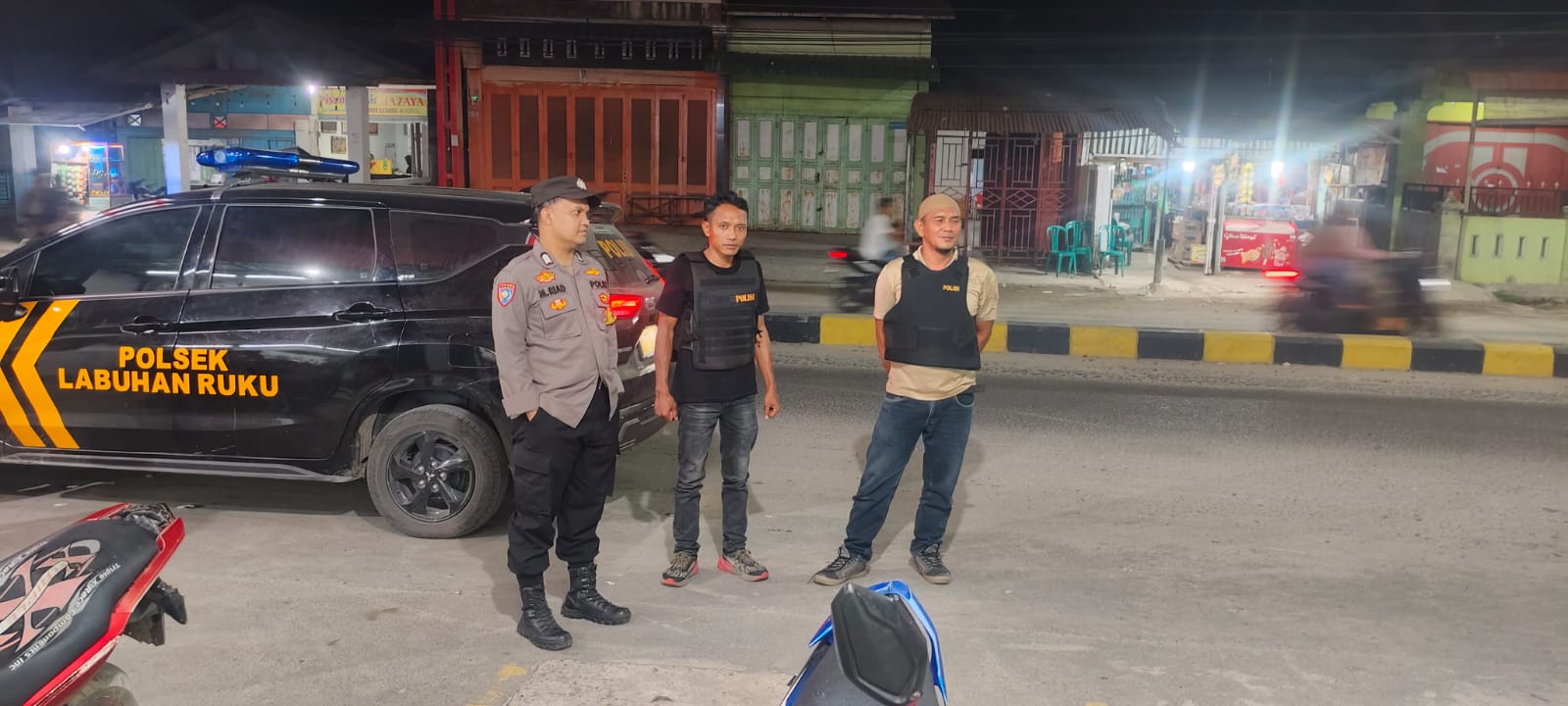 Personel Polsek Labuhan Ruku melaksanakan kegiatan patroli malam guna mengantisipasi potensi gangguan keamanan dan ketertiban masyarakat (kamtibmas) di wilayah hukumnya, Senin (9/3/2026) sekitar pukul 23.00 WIB.