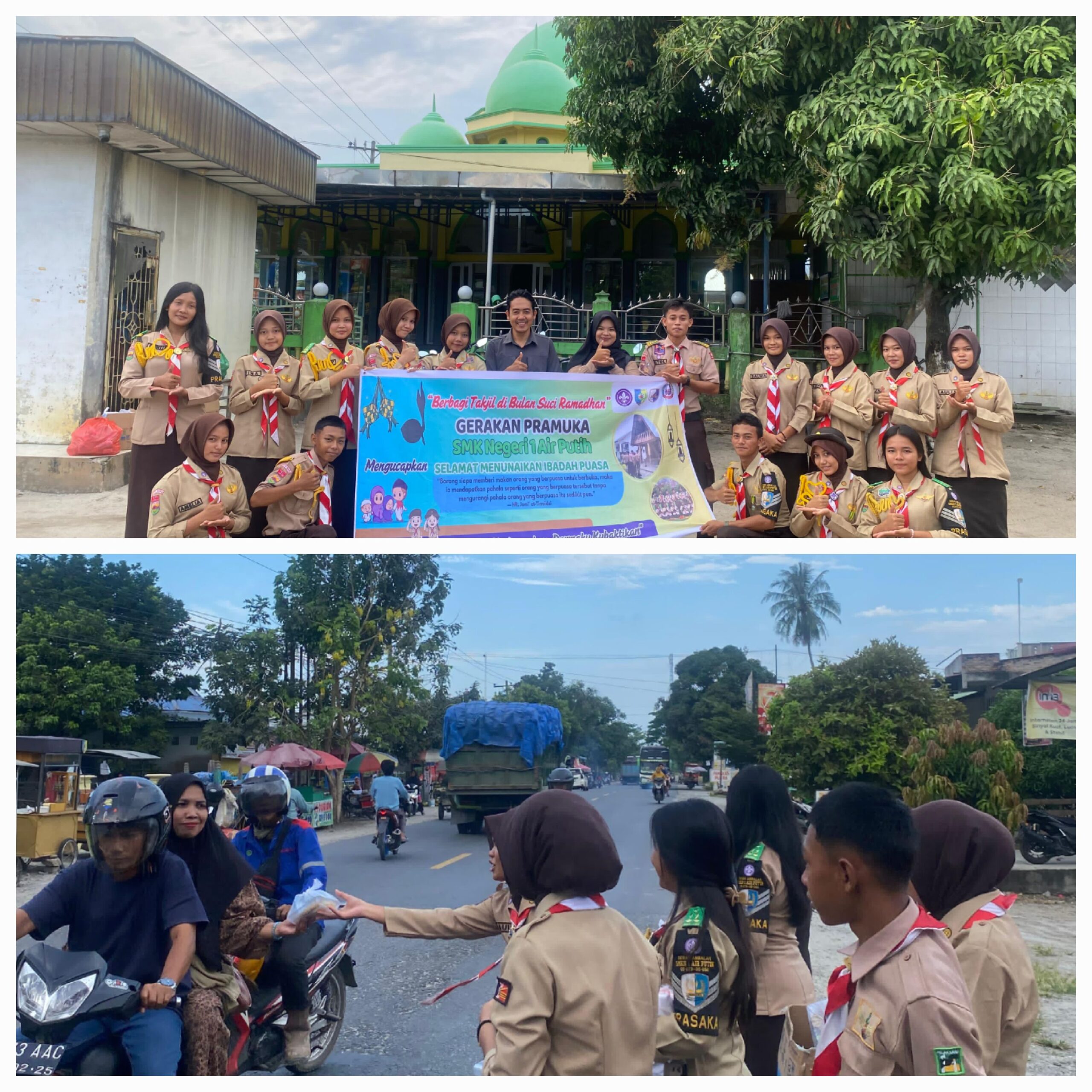 Dalam rangka menumbuhkan semangat kepedulian dan berbagi di bulan suci Ramadan, Gerakan Pramuka SMK Negeri 1 Air Putih menggelar kegiatan berbagi takjil kepada masyarakat. Kegiatan tersebut dilaksanakan di Jalan Lintas Sumatera Desa Sukaraja, Kecamatan Air Putih, Kabupaten Batu Bara, dengan membagikan sebanyak 150 paket takjil kepada para pengguna jalan. Jumat (13/3/2026)