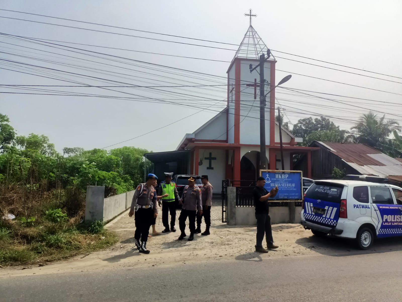 Personel Sat Lantas Polres Batu Bara bersama jajaran Polsek Labuhan Ruku melaksanakan kegiatan pengamanan ibadah gereja di wilayah Sei Balai, Jumat (3/4/2026).